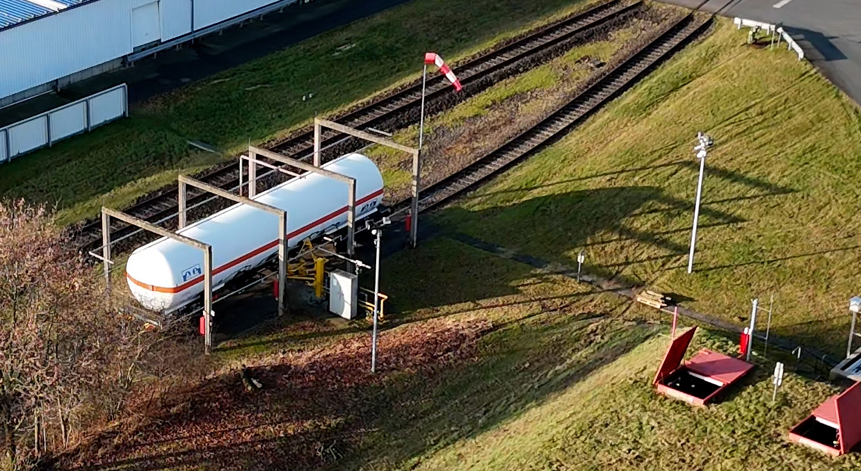Der Zug mit Kesselwaggon rollt auf dem firmeneigenen Gleis an, wird in Position gebracht und über den Verladearm mit den Tanks der Kaverne verbunden. Pro Waggon erreichen auf diese Weise 45 Tonnen Flüssiggas das Lager. Dieser tägliche Ablauf verlangt der Technik einiges ab. Deshalb wurde jetzt ein neuer Verladearm installiert.